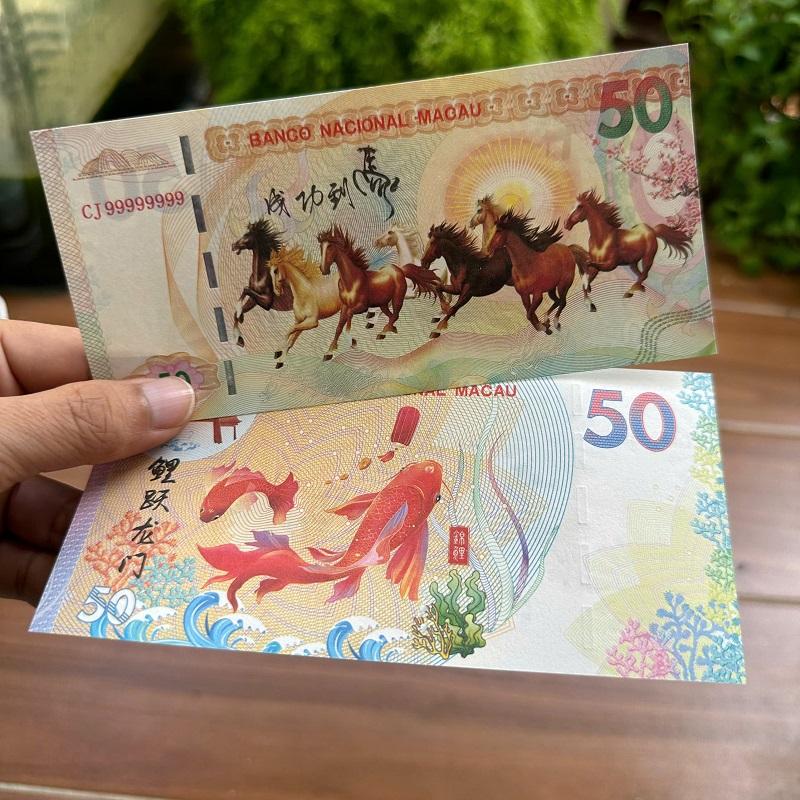 Bộ gồm 15 tờ tiền lưu niệm Macau in hình 8 chú ngựa phi nước đại – biểu tượng "Mã Đáo Thành Công", mang ý nghĩa may mắn, thành công, thăng tiến.